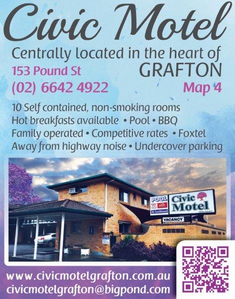 Grafton is situated on the beautiful Clarence River in Northern NSW and is famous for its Grafton July Racing Carnival, Bridge to Bridge Ski race and Jacaranda festival. If you are looking for Grafton accommodation, look no further than the Civic Motel, we are a family owned and operated 3.5 star rated Motel centrally located in the heart of Grafton. Situated in Pound Street adorned with the famous Jacaranda Trees. We are located in the centre of the city, away from the noise of the Highway, yet not high priced.