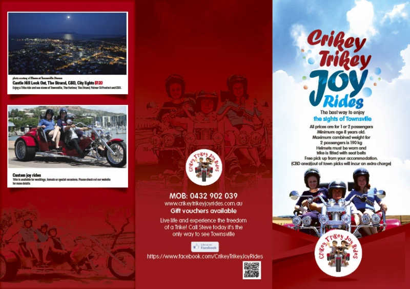 Crikey Trikey Joy Rides the best way to see the sights of Townsville. Enjoy 360 views experiencing the freedom of a Trike. An unforgettable experience that is Awesome!!! We pick you up from your accommodation cruise the CBD along The Strand and Castle Hill. Prices are for 1 or 2 passengers.