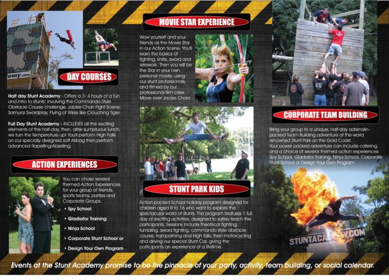 Stunt Academy Experience is a half or full day of Stunt training including obstacle course, Jackie chan fight scene, Samurai Swordfight and Flying on Wires.