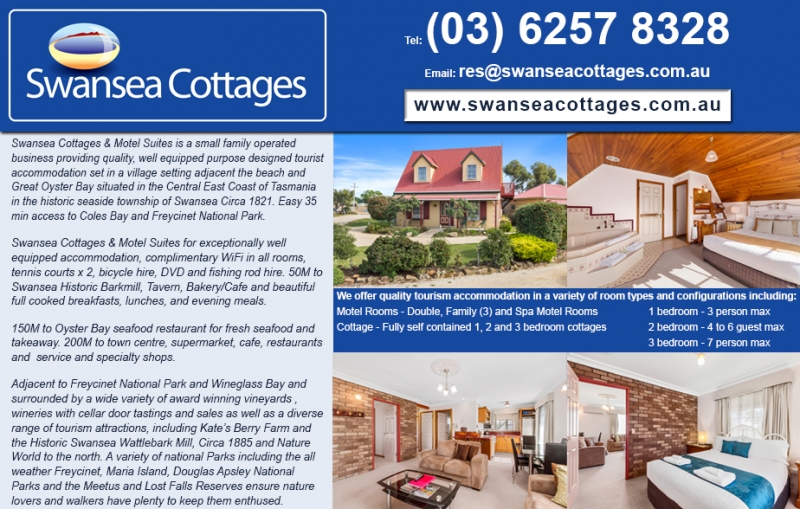 Unique tourist and holiday accommodation in a village setting situated in the East Coast Historic Town of Swansea(Circa 1821) adjacent Freycinet National Park and the world renowned Wineglass Bay.
