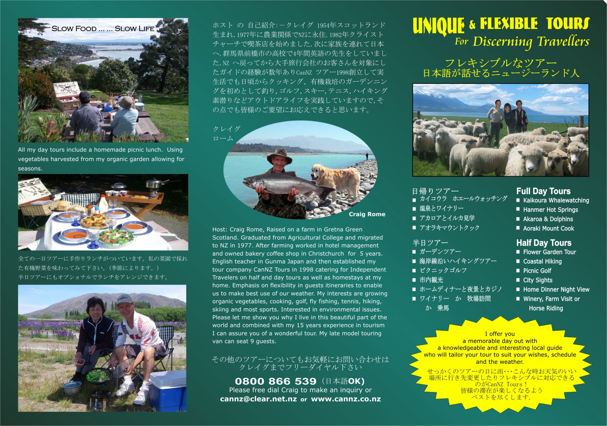 Hello I am Craig Rome of CanNZ Tours offering day and half day tours in Christchurch and around the South Island for English speaking as well as Japanese guests. I have been guiding here for 21 years. Emphasis on flexibility with itineraries to make the best of our weather and can offer homestay in my home as this can enhance your flexibility.