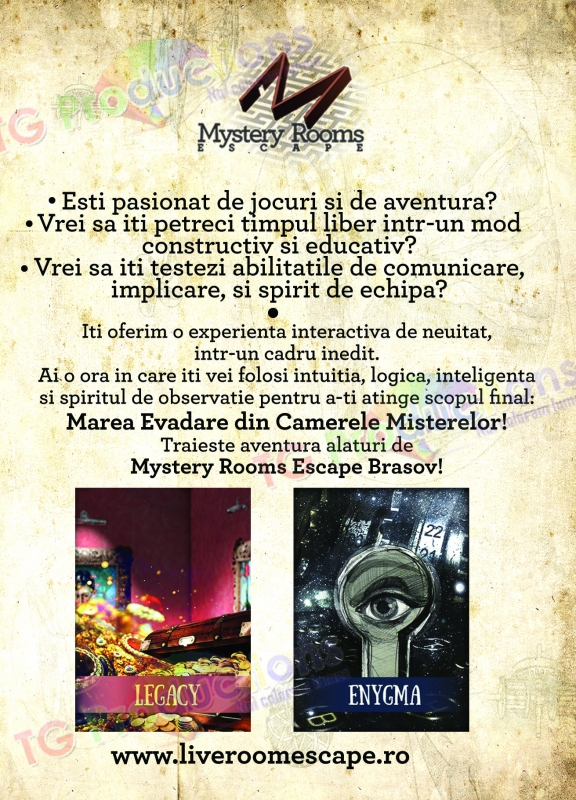 Mystery Rooms Escape Brasov is an entertainment game for all ages, for friends, family or business groups. You and your friends will be locked in a room and will have to discover the mystery, to reveal the secret messages and puzzles and finally to find the key to exit the room. The goal? To have fun with your friends for one hour! The scenarios are offered in both Romanian and English languages, so if you are an English speaker we guarantee you will enjoy one hour of mystery and entertainment.
