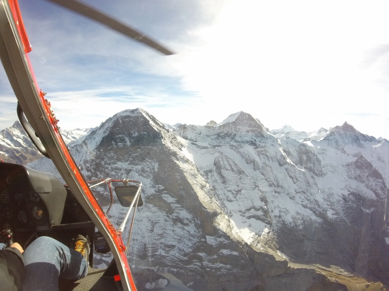 Breathtaking view while flying up in a helicopter to the peaks of the Swiss Alps.