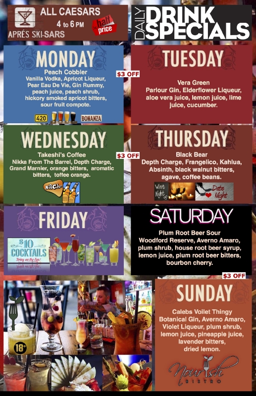 At nourish we aim to create unique craft cocktails using only the finest boutique spirits, local + organic ingredients, house made syrups, shrubs, preserved fruits, jams and marmalades. We believe that with the use of such products, complete with our careful touch and love for the game, we bring you nothing short of the best cocktail experience, in the Bow Valley! We also have a fabulous craft beer selection and an internationally recognized wine list.