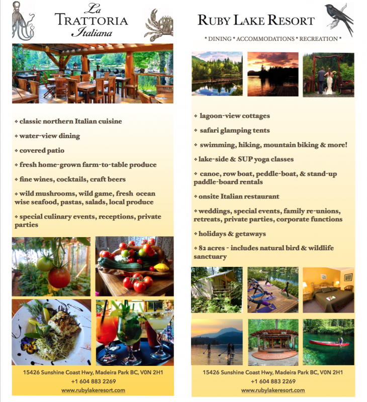 - Ruby Lake Resort & La Trattoria Italiana - Madeira Park (0.0 miles) - Nestled between the Caren Range Mountains and gorgeous Ruby Lake, Ruby Lake Resort is situated in a ...