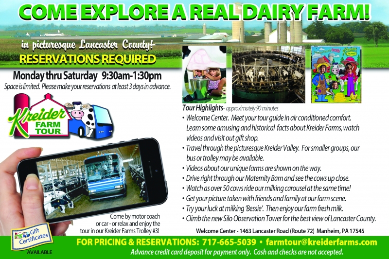 Enjoy a 90 minute, guided tour our our Dairy Farm located in Manheim, Pennsylvania. Our farm is a real, working dairy farm where we milk 1,700 cows three times a day. You will drive through our transition barn where you will learn about cow psychology and how the ladies move through the barn to assure they are happy and comfortable. You will enter the Milking Carousel to see the cows milked and receive a sample of our farm fresh milk. All guests who are at least 42" tall may climb our new Silo Observation Tower for a 360 degree view of our farm and the beautiful Lancaster County farmland surrounding Kreider Farms.