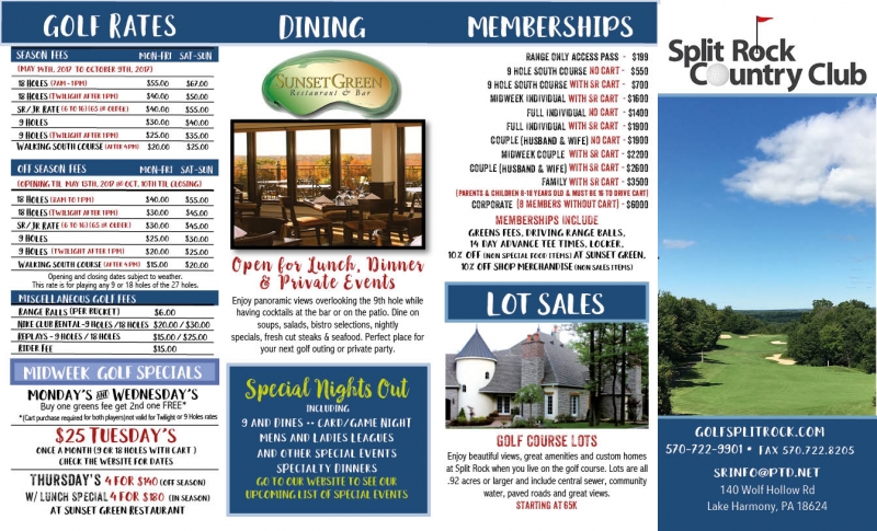 - Split Rock Golf Club Lake Harmony (0.0 miles) - Enjoy 27 Holes of Amazing golf. The club is open to the public and offers a 9 hole smaller course co...