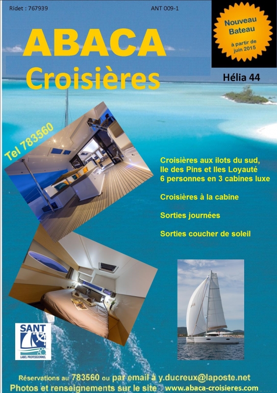 Discover New Caledonia from the sea, enjoy the desert islets, the coral reefs and the coloured fishes onboard a new catamaran fitted with the last type of comfort and accomodations for 6 persons maximum in 3 cabins. Full service on option.